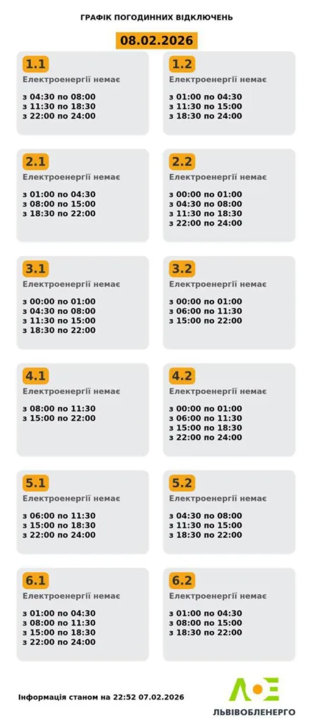 У Львові та Львівській області 8 лютого діятимуть погодинні відключення електроенергії. Залежно від черги, світла може не бути від 10,5 до 14 годин на добу.