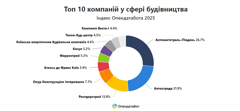 За даними Індексу Опендатабота 2025, сукупний дохід топ-10 будівельних компаній України склав 49,49 млрд грн — це на 41% більше, ніж у 2023 році.