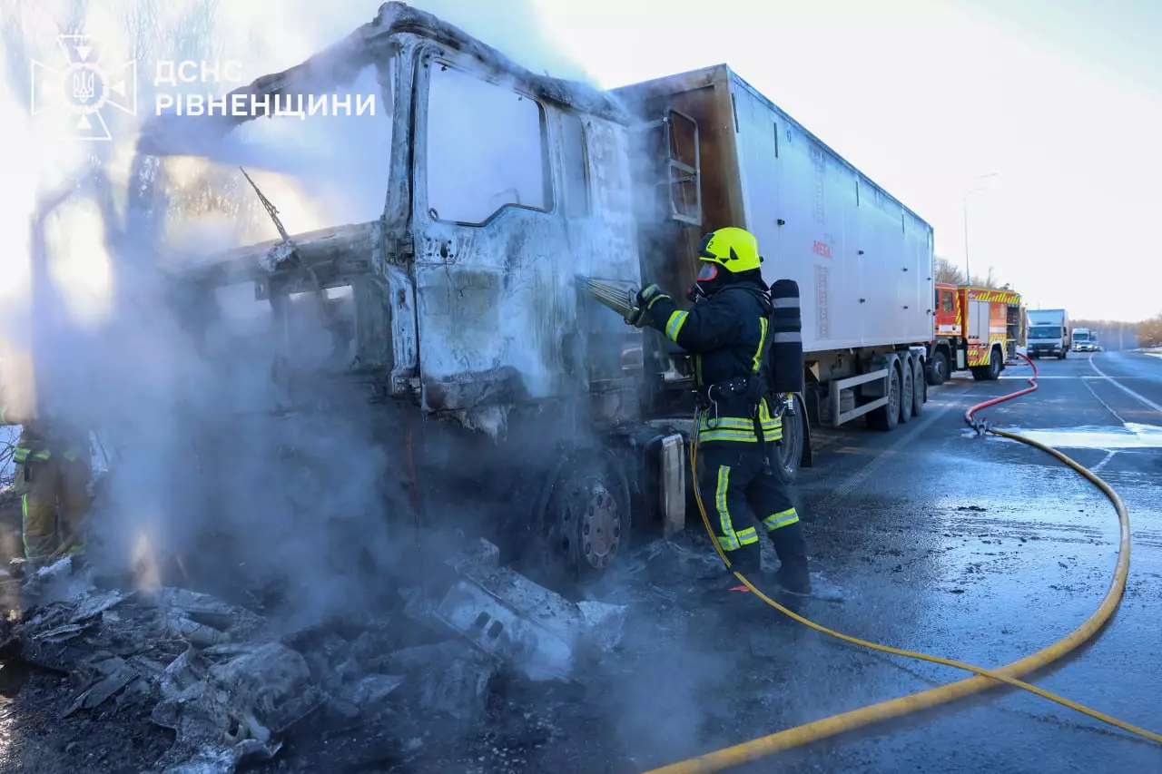 На автодорозі М-06 Київ—Чоп поблизу села Зелений Гай Дубенського району вранці 21 січня сталася пожежа вантажного автомобіля, який перевозив 24 тонни азотної селітри.