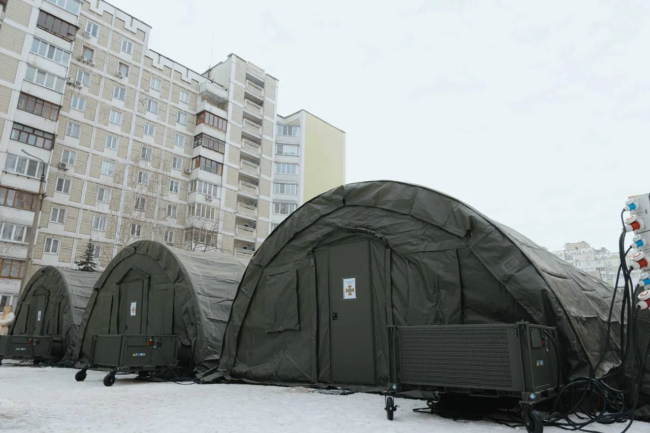 У мікрорайоні Троєщині у Києві розгорнули два наметові містечка для мешканців будинків, які залишилися без електропостачання та опалення внаслідок ворожого обстрілу.