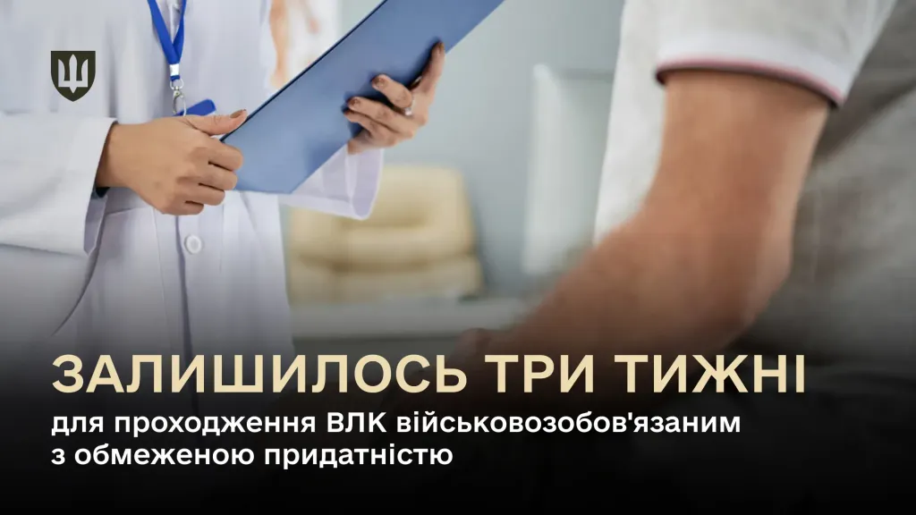 Міністерство оборони України нагадує, що військовозобов’язаним громадянам, які до 4 травня 2024 року були визнані обмежено придатними до військової служби, необхідно повторно пройти військово-лікарську комісію (ВЛК) до 5 червня поточного року.