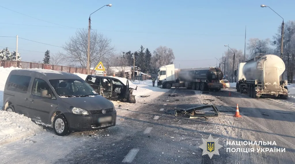 Як повідомили в поліції, попередньо встановлено, що зіткнулися вантажівка DAF під керуванням 24-річного жителя Сумської області та автомобіль Isuzu, за кермом якого перебував 40-річний житель Тернопільщини. Після первинного зіткнення Isuzu за інерцією врізався у мінівен Volkswagen.